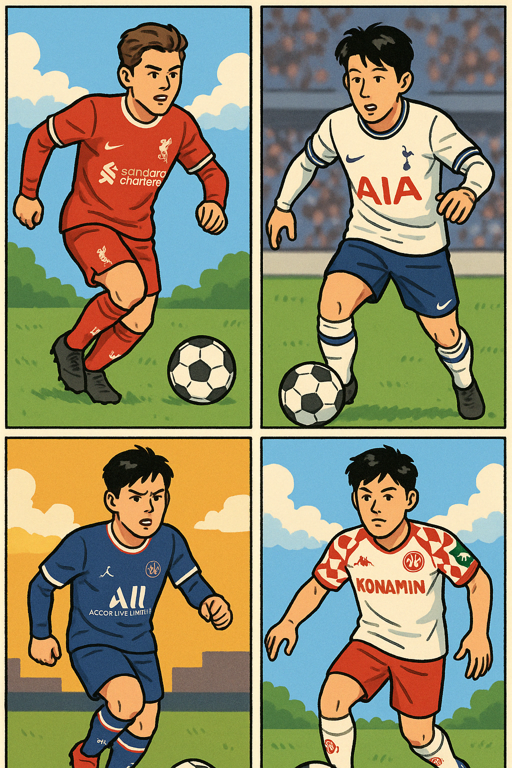 바이에른 뮌헨의 김민재, 토트넘의 손흥민, PSG의 이강인이 유럽 리그에서 활약하는 모습을 담은 4컷 만화 스타일 이미지