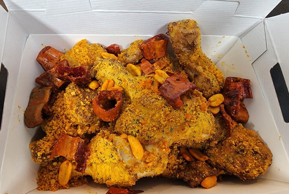 알싸한 고추 바사삭에 얼얼한 마라 후레이크를 더해 더 매콤하고 바삭하게! 볶은 땅콩으로 고소함도 UP! 마라 고추 바사삭입니다.(굽네치킨 홈페이지)