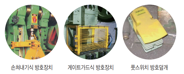 - 방호장치 - 프레스의 종류는 다양하고 생상하는 제품의 따라 작업특성이 다르기 때문에 두 종류 이상의 방호장치 설치