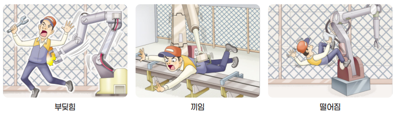 - 대책 - 산업용 로봇이 설치된 장소의 출입문 연동장치 해제사용 금지, 자동화 설비 이상발생 시 조치를 위한 정비작업 시에는 반드시 전원을 차단, 자동화라인 각 구조부에 대한 정비·점검 철저