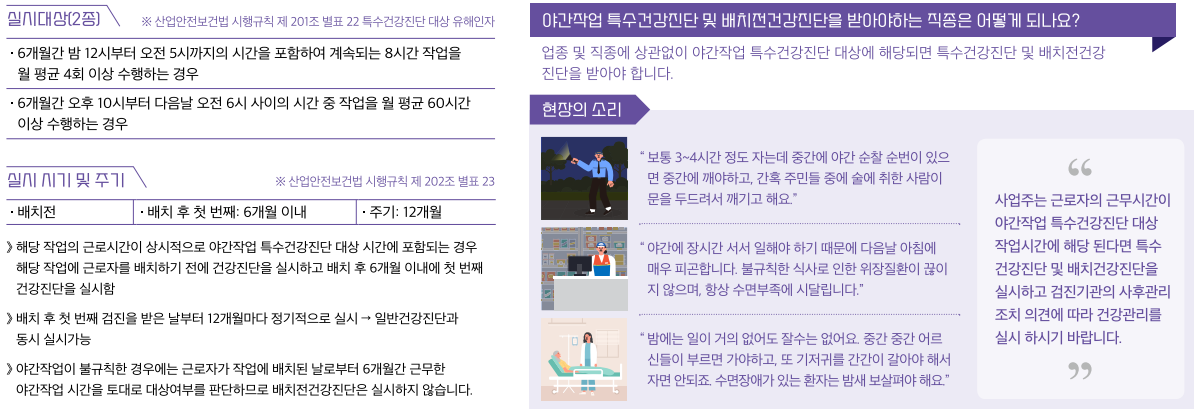 야간적업은 신체적 피로 및 스트레스가 높아 수면장애, 심혈괄 질환 등 다양한 건강문제를 야기합니다. 따라서 사업주는 야간작업 근로자를 대상으로 배치예정업무에 대한 적합성 평가를 위하여 배치전건강진단을 실시하고, 야간작업으로 인한 근로자의 건강장해를 조기 발견 및 사후관리를 강화하기 위하여 특수건강진단을 실시하여야 합니다.