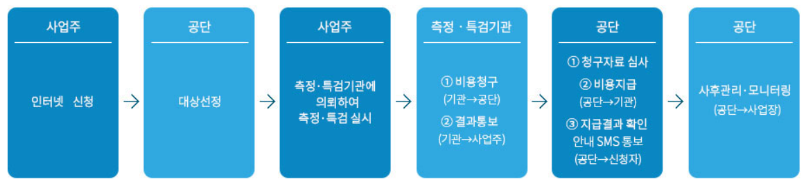 | 지원금액 | 신규측정 | 최초 측정 비용에 대해 전액지원 - 최대 100만원 지원 *과거 3년동안 측정 미실시 사업장 |