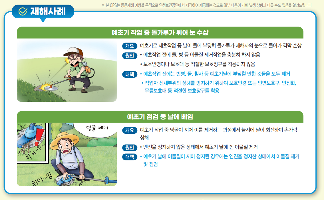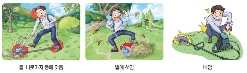 | 비산물로부터의 방호 | 예초작업 시에는 안전거리 확보 | 급격한 반동 방지를 위한 작업방법 숙지 |