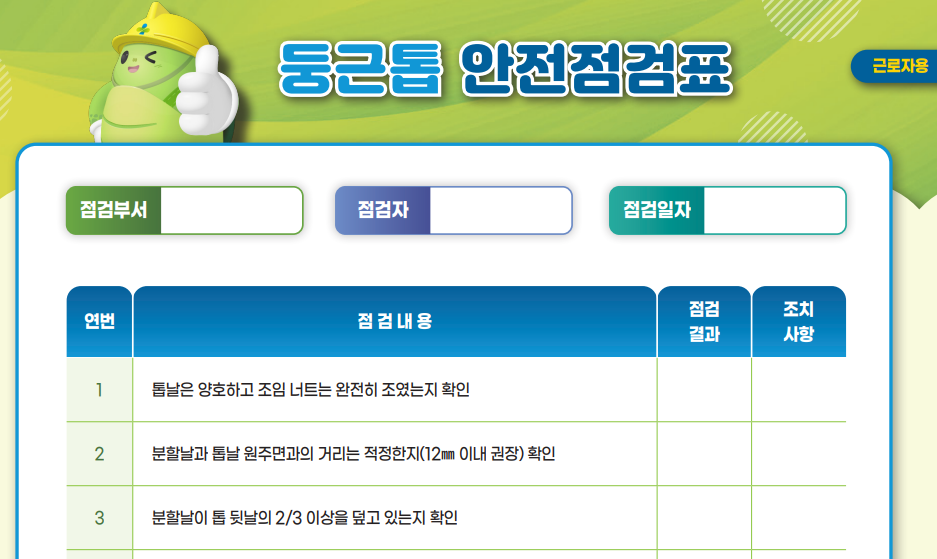 - 둥근톱기계의 고정상태가 견고한지 확인(바닥 면과의 지지 및 톱날고정 상태 등)