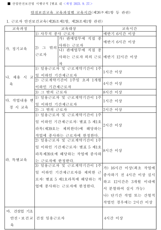 산업안전보건법 시행규칙 제26조에서는 교육 시간과 내용에 대해 구체적으로 규정하고 있습니다.